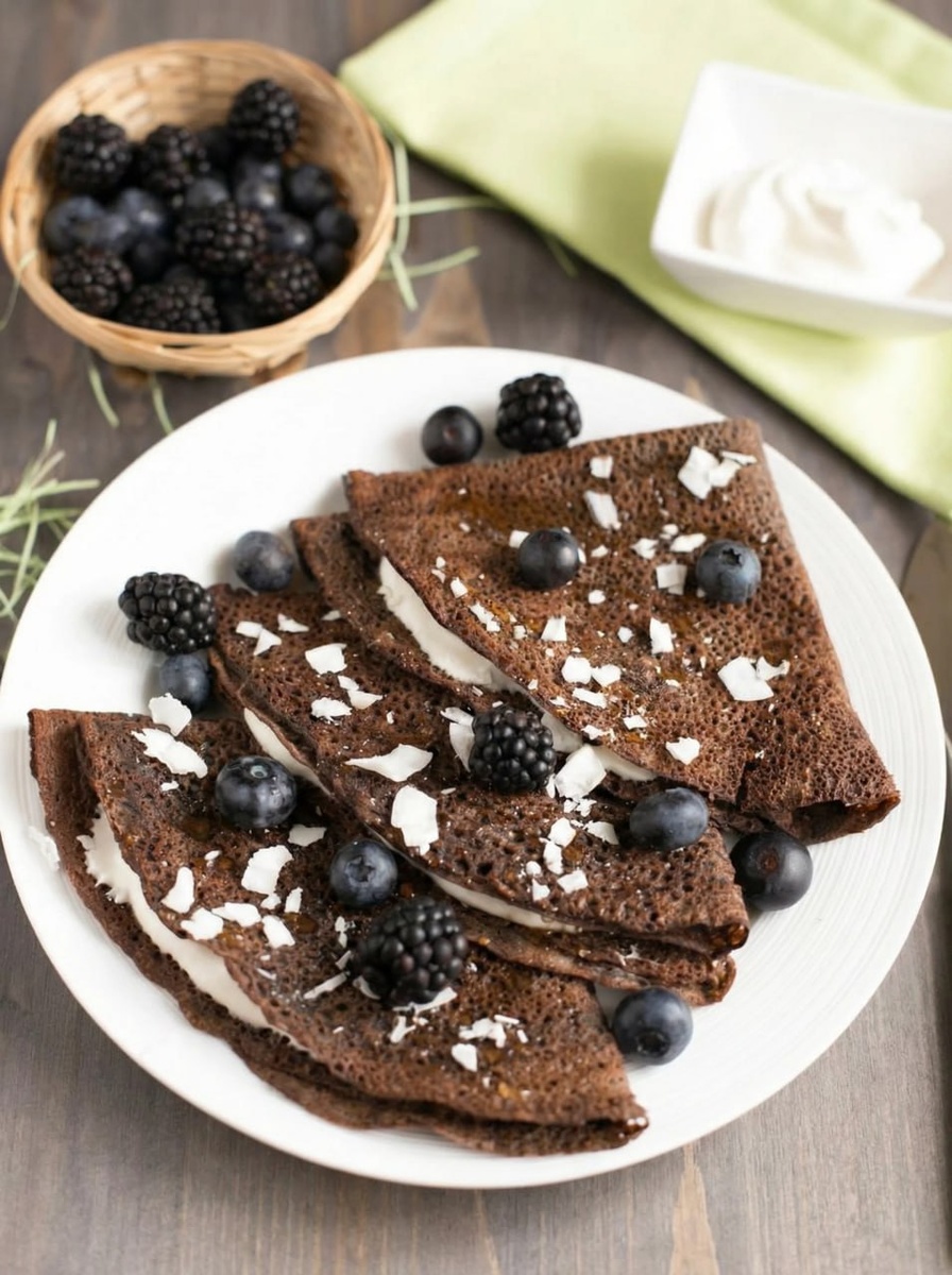 Необычные десертные блинчики «шоколадного» цвета получаются благодаря черёмуховой муке: она даёт яркий аромат и вкус. Готовятся быстро — Масленицу ждать не обязательно. Вам понадобится: Мука черёмуховая — 70 г Соль — ¼ ч.л. Сахар (песок) — 60 г Яйцо куриное — 3 шт. Мука пшеничная — 130 г Какао-порошок (нежирный 10–11%) — 10 г Ванильный экстракт — ½ ч.л. Молоко — 300 мл 1 этап Ингредиенты 1-го этапа: Мука черёмуховая — 70 г Черёмуховая мука — это измельчённые сушёные плоды черёмухи. Даже небольшая добавка даёт выраженный шоколадный цвет, необычный вкус и аромат выпечке. 2 этап Залейте муку стаканом (200 мл) кипятка, чтобы она набухла и не подсушивала тесто. Оставьте на 10 минут. 3 этап Ингредиенты 3-го этапа: Соль — ¼ ч.л. Сахар (песок) — 60 г Яйцо куриное — 3 шт. Добавьте соль, сахар и яйца. 4 этап Слегка взбейте смесь венчиком. 5 этап Ингредиенты 5-го этапа: Мука пшеничная — 130 г Какао-порошок (нежирный 10–11%) — 10 г Ванильный экстракт — ½ ч.л. Всыпьте пшеничную муку, добавьте