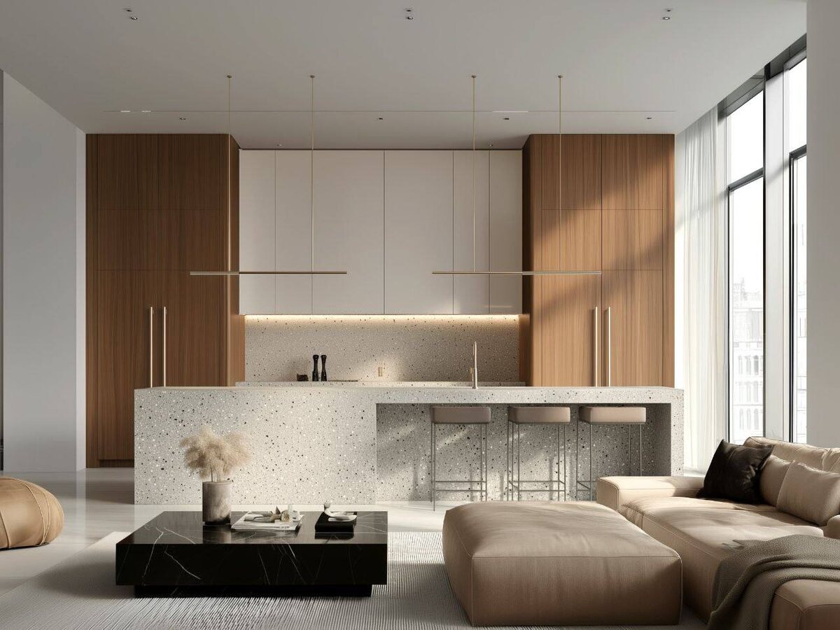» 🥰 В основе проекта — натуральный шпон Афромозия с выразительной текстурой, сочетающийся с глянцевыми фасадами из эмали и кварцевым камнем на острове. ✔️Тёплые оттенки древесины и светлая палитра создают ощущение воздушности и спокойного статуса. ✔️Центральный остров с варочной зоной и тремя посадочными местами превращает кухню в пространство для общения и вдохновения. ✔️Золотые ручки-рейлинги подчеркивают изысканность дизайна и связывают воедино лаконичную архитектуру мебели и отделки. Эта кухня — пример того, как в наших проектах технологии, эстетика и комфорт объединяются в безупречный баланс. 🔸 Рассчитать свой проект