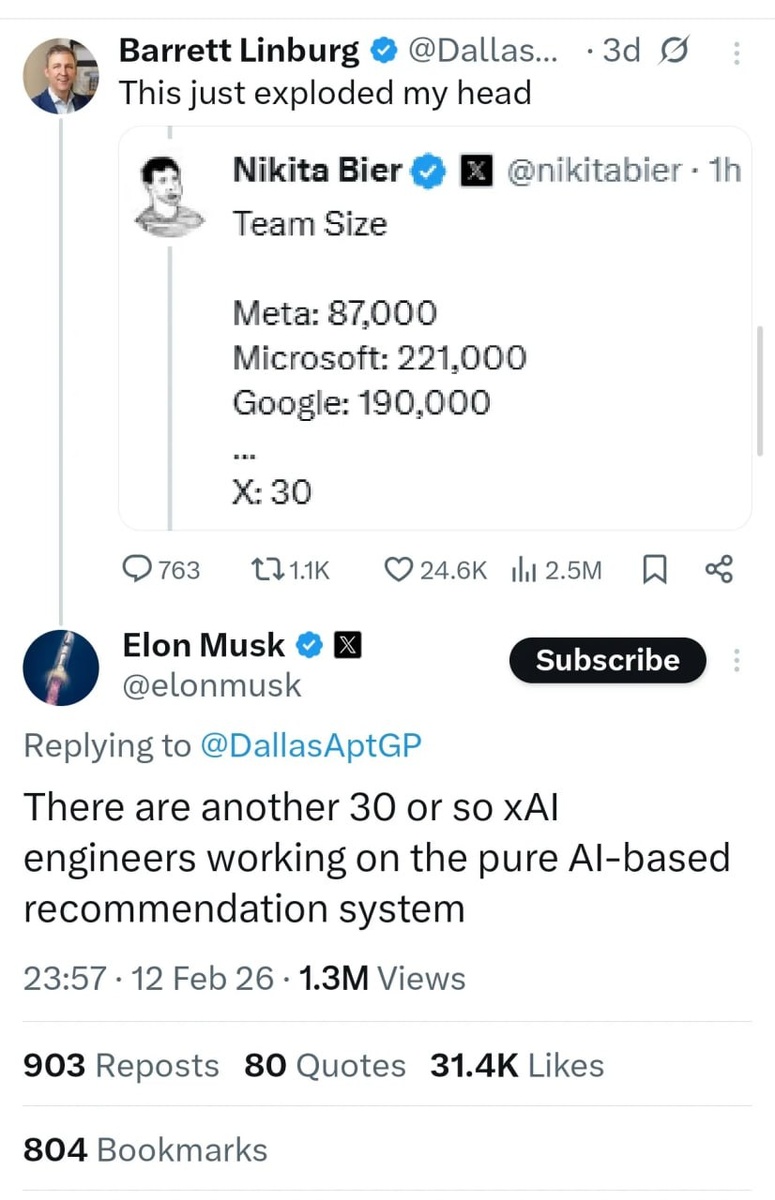 В X (запрещена в РФ) работает всего 30 ИИ- инженеров над рекомендательной системой. А вообще размер команд у гигантов подсвечен на картинке...