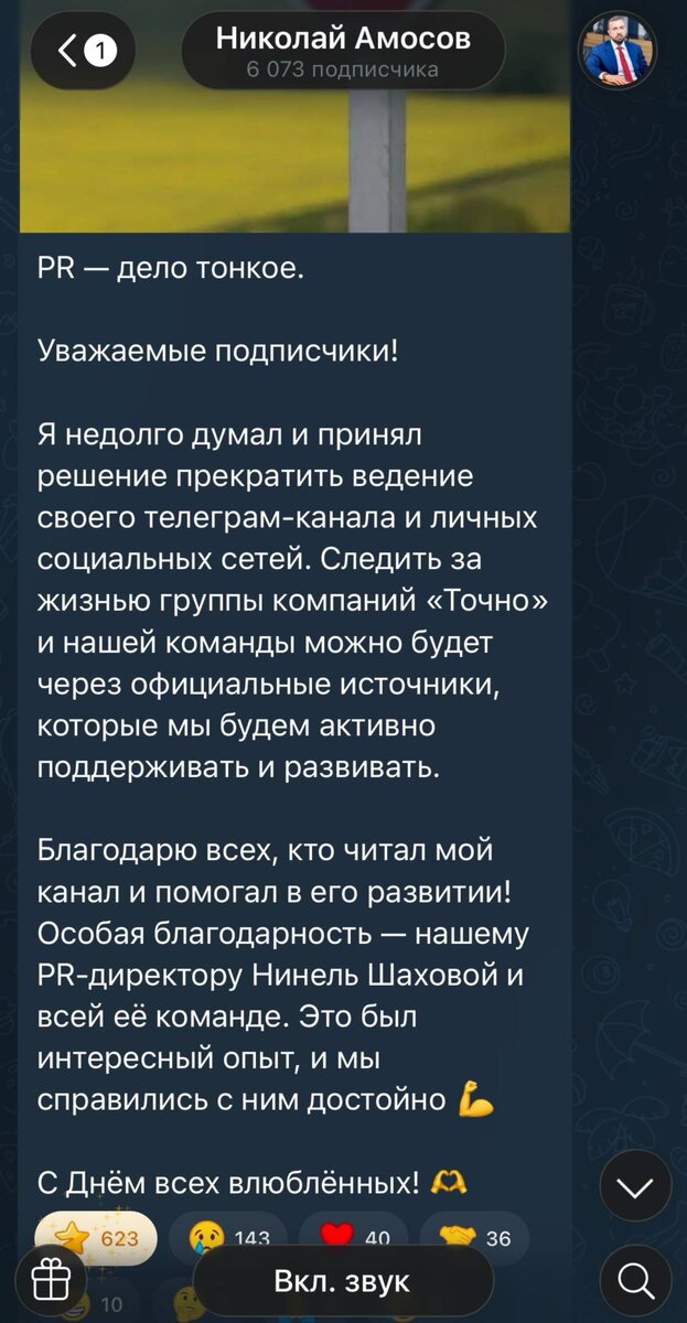 Критику компания ТОЧНО собирала уж точно не за личную страницу основателя. Я только недавно писал о том, что его открытость располагает. Надеюсь, его не за это признание про водку на подкасте докопали. Или приемка ЖК Патрики с кучей косяков располагает уйти из медиа пространства? Из-за симпатии к Амосову я даже формулировки использовал мягкие, и некоторые моменты вообще не поднимал лишний раз, потому что на фоне остальных застройщиков он человеком выглядел. Зря зря, пиар консультант так решил или Николаю просто надоело, но в 2026 году от персональной ответственности за компанию никуда не денешься, а своя версия событий всегда лучше, чем та которую я додумаю. Ну ладно ладно, некоторым людям действительно лучше молчать, чем говорить, но это к Николаю не относится, нормально он вел канал. На втором скрине восприятие отрасли, все написали вот так, типа первым лицам надо «сосредоточиться на бизнесе». А то три поста в неделю бизнесу мешало ага. Тем более, у чувака из Глоракса с бесцветны
