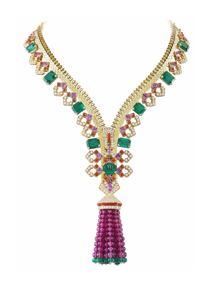 У ювелирного дома Van Cleef & Arpels есть украшение Zip - колье, созданное по мотивам обычной застёжки-молнии. Его идея появилась в 1930-х годах, а первый экземпляр вышел из мастерских только в начале 1950-х после более чем десяти лет разработки. Считается, что на создание украшения повлияла Уоллис Симпсон, которая была близким другом Дома и имела внушительную коллекцию его украшений. По одной из версий, именно она предложила художественному директору Рене Пюиссан создать изделие, которое смогло бы работать по принципу молнии. Уоллис, в свою очередь, на эту идею вдохновило творчество Эльзы Скиапарелли. Модельер в 1930-х представила кутюрные платья с молниями, которые не были скрыты, а стали частью самого дизайна. В результате получилось украшение, которое можно носить как колье, а в полностью застегнутом состоянии оно превращается в браслет. С момента выпуска Zip стал одной из самых узнаваемых моделей Дома. Его создают в золоте и платине, украшают бриллиантами, сапфирами, рубинами и др