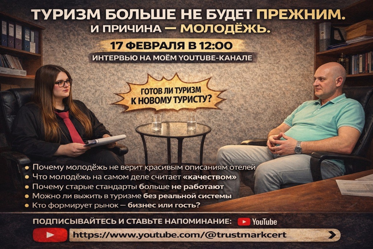 И причина — молодёжь. 17 февраля в 13:00 на моём YouTube-канале выйдет интервью, в котором мы общаемся с Анной Тарчинской — тревел-блогер нового поколения. Это разговор без дипломатии. Мы обсуждаем: • Почему поколение Z не верит красивым описаниям отелей • Что молодёжь на самом деле считает «качеством» • Почему старые стандарты больше не работают • Можно ли сегодня выжить в туризме без реальной системы • Кто формирует рынок — бизнес или гость Это коллаборация зрелого качества и молодого авантюризма. Системность против спонтанности. Опыт против скорости. И главный вопрос: готов ли туризм к новому туристу? Если вы владелец гостиницы, туроператор или управляете сервисом — это интервью может оказаться для вас неудобным. Но полезным. Если вы молодой путешественник — вам будет интересно узнать, как устроена индустрия изнутри. 📅 Премьера: 17.02.2026 в 13:00 Подписывайтесь и ставьте напоминание: 👉 https://www.youtube.com/@trustmarkcert Посмотрите первыми. Будет честно.