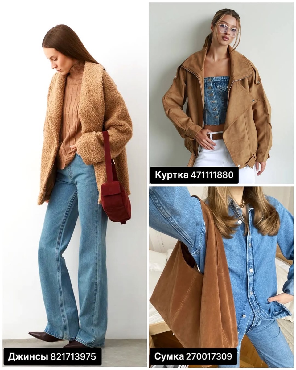 Есть палитры, которые всегда работают на впечатление «всё продумано». Карамель, кофе с молоком, песок и мокрый асфальт — это оттенки, которые легко собрать в гармоничный гардероб. На фото — как раз такие образы: уютный повседневный деним с мягкой фактурой, эффектная замшевая куртка с белым низом и элегантные сумки, которые делают комплект «взрослым» и завершённым.