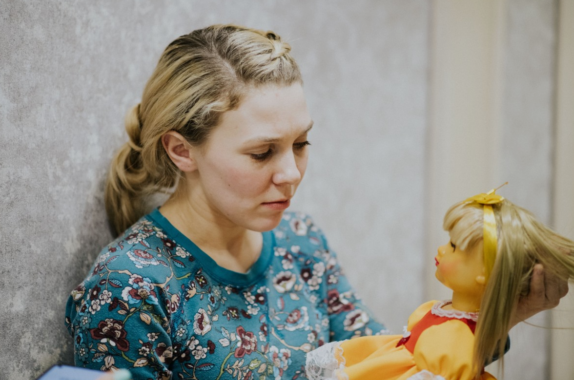 Мама сидела на небольшом диванчике, держа в руках куклу и чему-то улыбаясь.