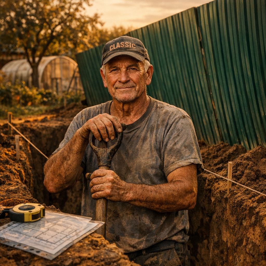 Первый штык вошёл в землю у начала забора. У самого профлиста — но на моей стороне. Сантиметр в сантиметр по кадастровой границе. Я вымерял накануне. Колышки. Верёвочка. Рулетка. Как на производстве — допуск плюс-минус ноль.