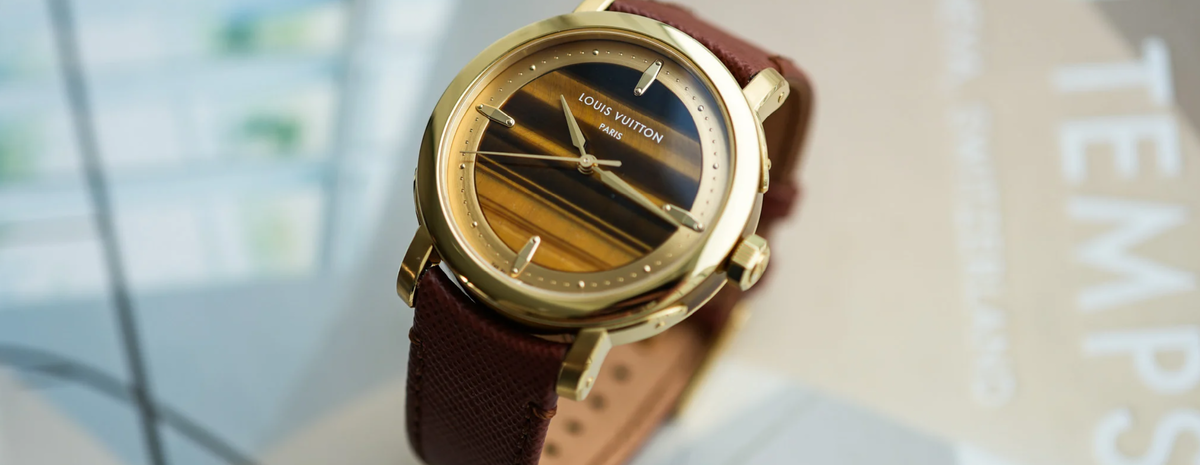 В линейке моделей Louis Vuitton Escale, представленных в этом году, Escale Tiger’s Eye выделяется сразу по нескольким параметрам. Эти изысканные часы с индикацией только времени используют камень тигрового глаза не только для циферблата, но и для средней части корпуса.