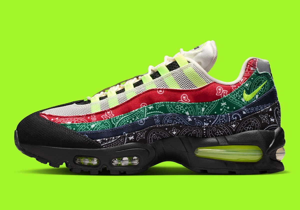 Nike Air Max 95 представили новую расцветку Bandana, основанную на классической версии Neon. Верх кроссовка сохраняет привычную градацию серых тонов с яркими акцентами, но боковые панели выполнены в многоцветной расцветке: красный, зеленый, синий и черный. Официальная дата релиза пока не объявлена, но ожидается, что модель поступит в продажу в ближайшие недели.