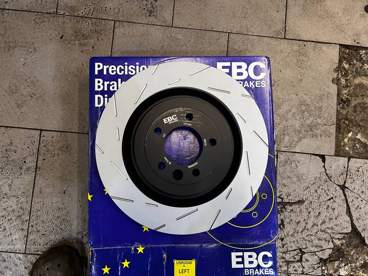 И вот спустя 6000 км этот пятилитровый красавец приехал к нам опять, чтобы выкинуть практически новые задние оригинальные тормоза и установить заместо них единственный достойный такого автомобиля комплект от EBC Для таких автомобилей мы устанавливаем слотированые диски EBC ultimax в сочетании колодками синей серии ndx Данные колодки обладают очень высоким коэффициентом трения 0,52 и колоссальной термостабильностью вплоть до 550 градусов цельсия. Это все обеспечивает очень качественное и стабильное торможение на любых скоростях. Всем добра.