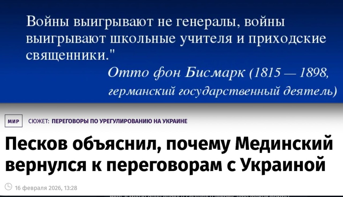 Помощник президента России Владимир Мединский всегда оставался главой российской делегации на переговорах с Украиной, хотя и не участвовал в предыдущих раундах в Абу-Даби. Об этом 16 февраля заявил официальный представитель Кремля Дмитрий Песков. «Главой делегации российских переговорщиков является Мединский. Это заявление [президент России Владимир] Путин делал до первого раунда в Абу-Даби, во время и так далее. Поэтому Мединский оставался главой делегации наших переговорщиков», — сказал он в ходе брифинга