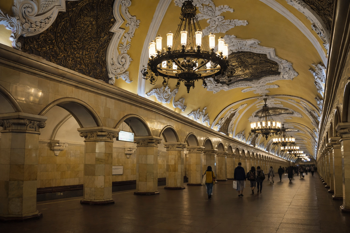В Москве можно спешить куда угодно, но стоит хотя бы раз остановиться и посмотреть по сторонам. Особенно — в метро. Московский метрополитен — это не просто транспорт. Это подземный музей, куда ежедневно спускаются миллионы людей, часто даже не поднимая глаза. Я не раз ловила себя на мысли: туристы едут в столицу ради музеев, а настоящие шедевры — прямо под землёй, между пересадками. Вот девять станций, которые действительно стоит увидеть. Подписывайтесь в наш канал в MAX. Там даем промокоды на туры, эксклюзивный контент и горящие предложения! Это метро в формате дворца. Огромные своды, лепнина, мозаики, золото. Станция была открыта в 1952 году и задумывалась как парадный вход в столицу для приезжающих с трёх вокзалов. Масштаб чувствуется сразу. Если хотите понять, почему московское метро называют «подземным дворцом», начинайте отсюда. Совсем другая эстетика. Лёгкая, воздушная, с ар-деко и потолочными мозаиками. Открыта в 1938 году. В годы войны здесь даже проходили заседания и укрывал