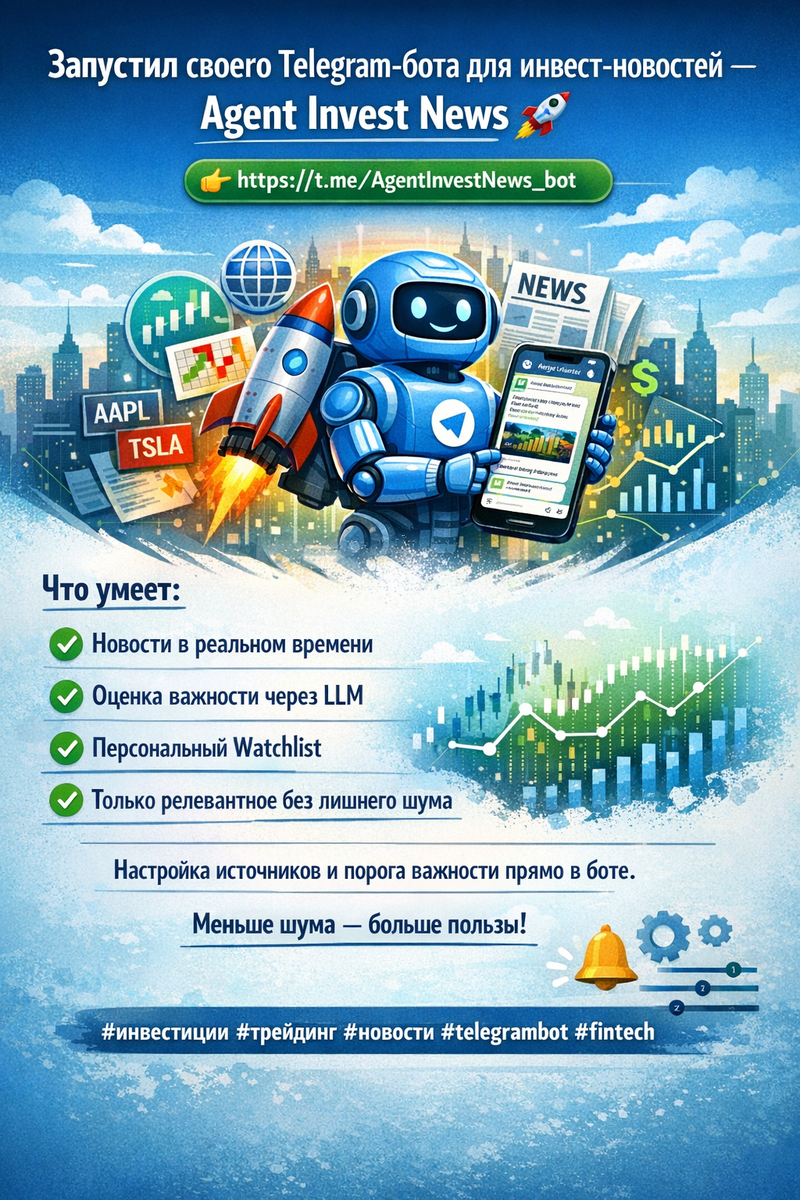 Идея создать своего бота пришла не потому, что я хотел «стартап». А потому что я устал от шума. Каждый день — десятки новостей. Какие-то важные, какие-то вообще не имеют значения. В какой-то момент я поймал себя на мысли: я трачу больше времени на фильтрацию новостей, чем на сами инвестиции. И тогда появилась идея — сделать бота, который будет фильтровать всё за меня. Я не стал искать похожего бота, так как хотелось опробовать в деле Codex для реальной задачи и оценить скорость разработки. До этого я использовал ChatGPT, Qwen, DeepSeek для генерации отдельных участков кода. Тут я полностью поручил задачу Codex. Так появился 👉 https://t.me/AgentInvestNews_bot (на данный момент использование бота бесплатно) Сначала это выглядело как обычная мысль из серии: «Было бы удобно, если бы кто-то присылал только важные новости…» Но потом я понял — этим «кто-то» может быть код. Я начал с простого вопроса: можно ли через Codex собрать систему, которая: сама собирает новости, сама их анализирует, с