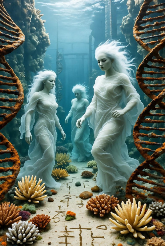 За аркой портала открывался зал, защищённый барьерами из гигантских водорослей, не пропускающих загрязнители. Дальше был отсек, отделённый мембраной тоньше паутины. Внутри плавали не рыбы, не медузы, а вялые маленькие существа, похожие на человеческих детей с печальными глазами. Их тела были покрыты тусклой голубоватой чешуёй, слабо мерцающей, когда они, держась за руки-плавники, медленно кружились, будто боялись, что скоро их танец прервётся навсегда. Взрослые – высокие, серебристые, с перепонками, дрожащими от невидимого течения – совершали над ними то ли обряд, то ли лечебные процедуры.