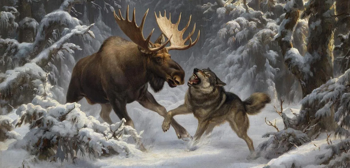 Тридцать метров. Достаточно. Чингиз стоял сзади и просто облаивал зверя, не пытаясь сделать хватку, Серый же крутился перед мордой и норовил схватить бычка за ноздри. Видимо ему это удавалось, снег был залит алым. В какой то момент Серый дернул правым ухом в мою сторону и захлебнулся яростью. Сохатый ринулся вперёд передними ногами, но мимо.