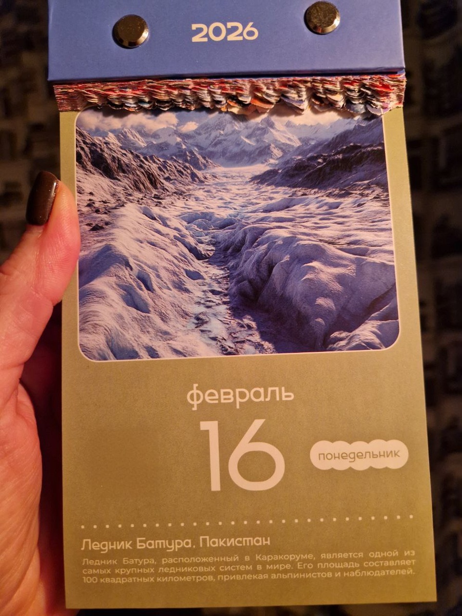 Ух, как хочется тепла! Но про локацию из календаря всё же немного расскажу, поизучала же. Ледник Батура, расположенный в горах Каракорум, Пакистан, входит в число крупнейших ледников мира. Его долина окружена высочайшими вершинами, высота которых превышает 7000 метров. Язык ледника спускается до отметки 2540 метров, практически достигая берегов реки Хунза и пролегающего неподалеку Каракорумского шоссе, связывающего Китай и Пакистан. Такое близкое расположение имеет огромное практическое значение: любое колебание края ледника оказывает прямое влияние на транспортную инфраструктуру региона. Именно поэтому ледник Батура стал объектом пристального внимания китайских экспедиций, проводивших детальные исследования. Согласно историческим данным, за последние два столетия ледник трижды активно двигался вперед и дважды отступал назад. Сегодня ледник простирается почти на 60 км и на его площади спокойно можно разместить 16 Зеленоградсков. Впечатляет! #виртуальноепутешествиепомиру