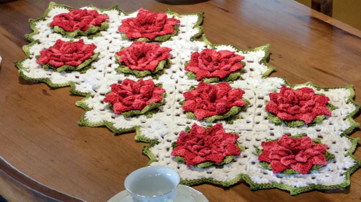 В первом варианте мотивы вяжутся как часть тканевой скатерти. Также есть вязаная кайма, которая тоже используется в изделии.