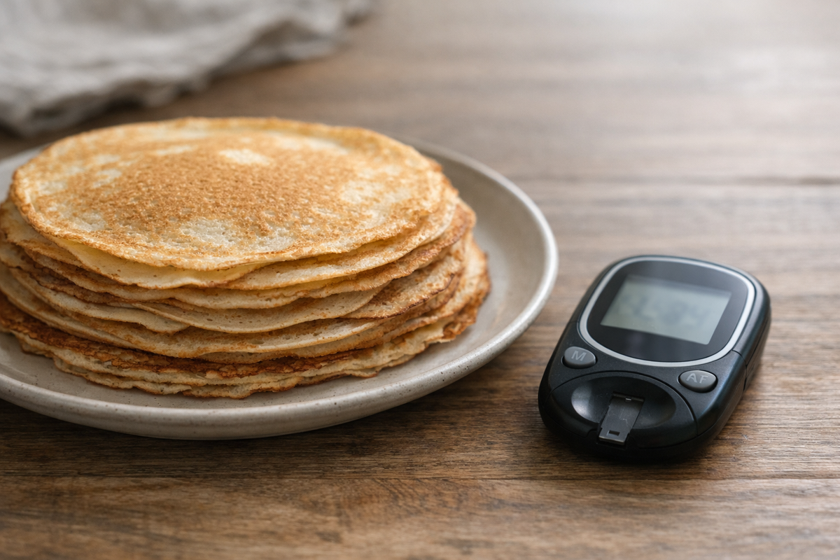 Я решил посчитать. И приготовить по-умному. Обычный тонкий блин — это в основном мука. В одном среднем блине — около 12–15 г углеводов.