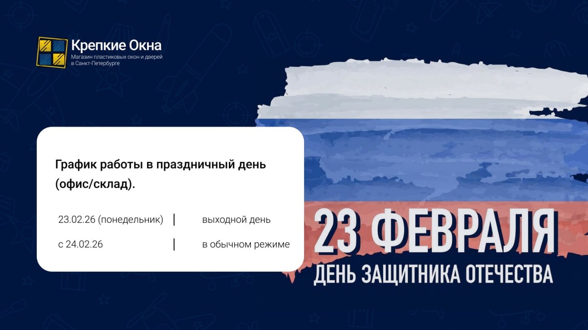 ! Сообщаем, что 23 февраля (понедельник) наш офис и склад будут закрыты. Мы вернёмся 24 февраля и с радостью продолжим работу. Заранее благодарим за понимание и поздравляем с праздником!