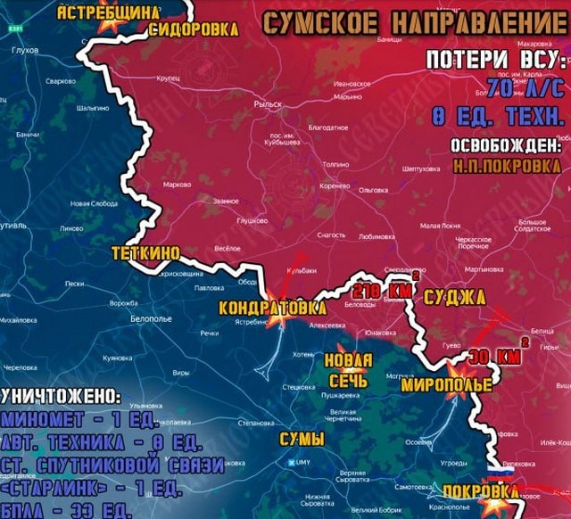 В группировке войск «Север» ВС РФ, создающей полосы безопасности в Харьковской и Сумской областях, рассказали об изменении текущей обстановки на фронте в приграничье за минувшие сутки. 16 февраля на Сумском направлении продолжались ожесточенные встречные бои. Штурмовые группы Северян сохраняли темпы продвижения вглубь Сумской области на 11 участках в Глуховском, Краснопольском и Сумском районах, продавливая оборону противника при поддержке артиллерии и «Солнцепеков». Противник активизировался, пытаясь контратаковать, и проводил ракетные атаки на гражданские объекты приграничных областей. На аэродроме Конотоп в Сумской области ударом ОТРК «Искандер-М» уничтожена площадка запуска ударных дронов дальнего действия — свыше 80 БПЛА и более взвода личного состава операторов. Отражена безуспешная атака ВСУ возле Андреевки, украинское командование не оставляет попыток вернуть под контроль утраченные позиции возле Покровки. Эта контратака противника также была сорвана. На Теткинском и Глушковско