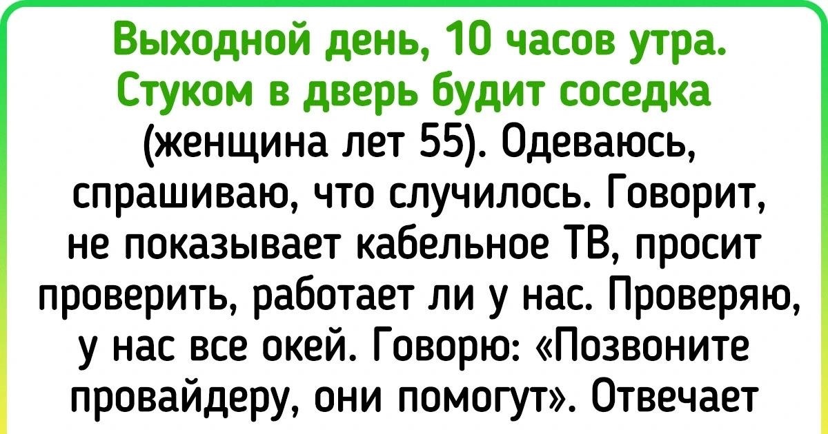 “Соседка разбудила утром и сказала, что у нее не работает кабельное ТВ. Я проверил, у меня все работает. Говорю ей позвонить провайдеру. Она отвечает: «Я звонила, они сказали, что отключили за долг. Просто подумала, может, у всех не работает».”