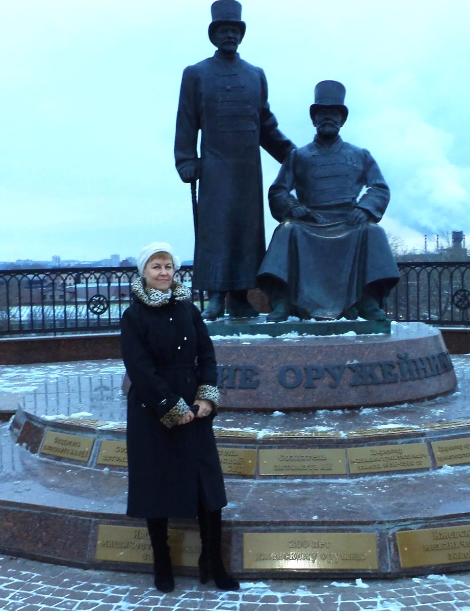 Дело в том, что в царской Росси лучшим мастеровым жаловались царский кафтан, пошитый по специальному заказу, цилиндр, трость и перчатки. Внизу на постаменте памятника на табличках выгравированы имена лучших оружейников в Ижевске — М. Т. Калашникова, Г. Н. Никонова, В. А. Ярыгина, Е. Ф. Драгунова, а также имена директоров «Ижмаша» — Белобородова, Ионова, Палагина и названия производителей стрелкового оружия — Ижевского машиностроительного и Ижевского механического заводов.