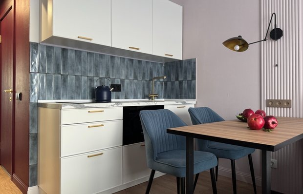 Решения, которые легко повторить и в вашем интерьере Профессиональный дизайнер и хоумстейджер Вера Старкова реализовала уникальный проект по обустройству студии в московской новостройке. Студия с готовым ремонтом от застройщика предназначена для долгосрочной аренды. Основной задачей было создать функциональное пространство, которое визуально выглядело бы дороже своих реальных затрат. Показываем классные идеи из проекта, которые точно заслуживают вашего внимания. Концептуальное название проекта — «Сердце океана». Это название отражает вдохновение, черпаемое из известной истории о бриллианте с тем же названием, и стало основой для создания стиля интерьера. Синий цвет, символизирующий океан и бриллиант, подчеркивает многогранность, а красный добавляет ноту любви и страсти. Несмотря на яркость, пространство остается светлым и воздушным, создавая атмосферу романтики. В обеденной/рабочей зоне был разработан нестандартный стол, который выполняет две функции: служит как стол для еды и рабочая