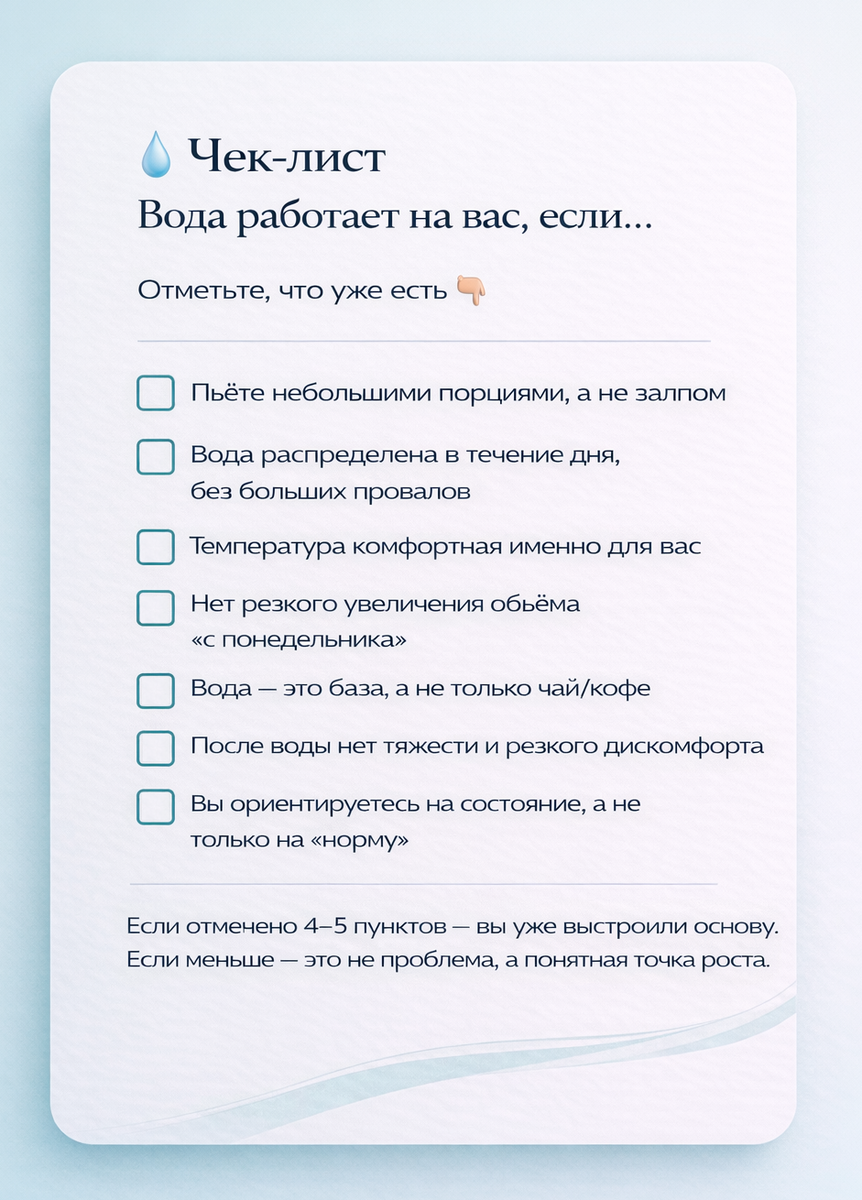 10 мифов о воде, в которые до сих пор верят Мы разобрали лимфу, ритм питья, жажду, отёки, кожу. Теперь соберём главное — коротко и по делу. ❌ Миф 1. «Всем нужно 2 литра в день» Нет универсальной нормы. Потребность зависит от веса, активности, питания, климата и состояния нервной системы. ❌ Миф 2. «Если есть отёки — нужно пить меньше» Ограничение воды чаще усиливает её задержку. Проблема обычно в регуляции, а не в объёме. ❌ Миф 3. «Чай и кофе — это та же вода» Это жидкость, но не нейтральная. Активные вещества влияют на гормоны и скорость выведения воды и электролитов. ❌ Миф 4. «Нет жажды, значит всё нормально» Сигнал жажды может притупляться при стрессе и хроническом напряжении. Отсутствие сигнала — не всегда признак нормы. ❌ Миф 5. «Чем больше выпить залпом, тем лучше “промоет”» Организм лучше усваивает воду, когда она поступает ритмично. Большие объёмы разово усиливают не только выведение жидкости, но и потерю электролитов — натрия, калия, магния. В результате можно получ