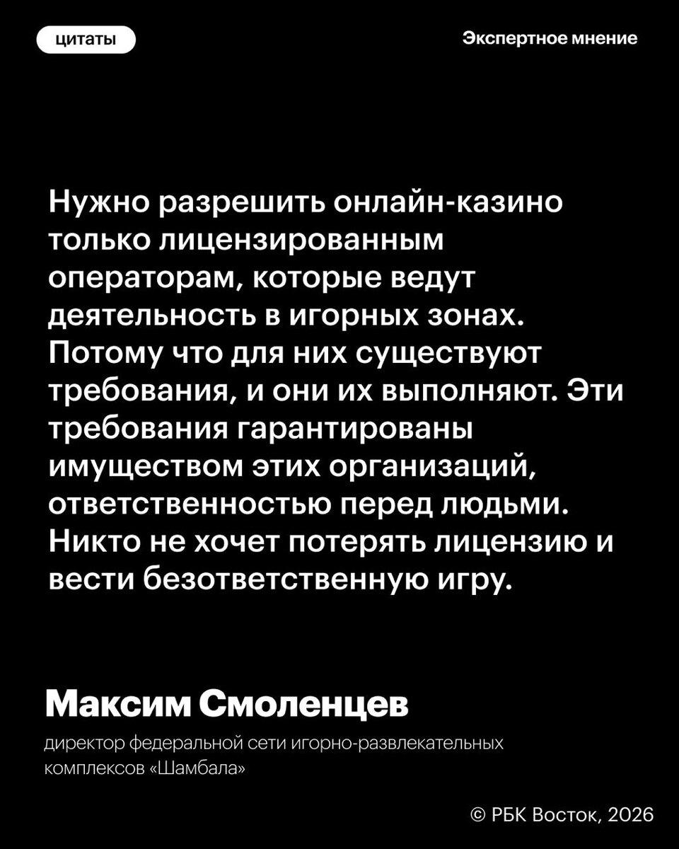 Для этого, считает Минфин, нужно создать специального оператора, который будет отчислять в казну не менее 30% выручки от такой деятельности. В этом случае, по оценке ведомства, доходы бюджета от индустрии могут составить 100 млрд руб. ежегодно О том, как возможный вывод онлайн-казино из тени может повлиять на игорный бизнес, букмекерские конторы и на количество лудоманов в регионе, РБК Приморье в рамках программы «Суть дела» рассказали эксперты. Читайте и смотрите мнение на нашем сайте. 🔗 РБК Восток в Telegram и MAX
