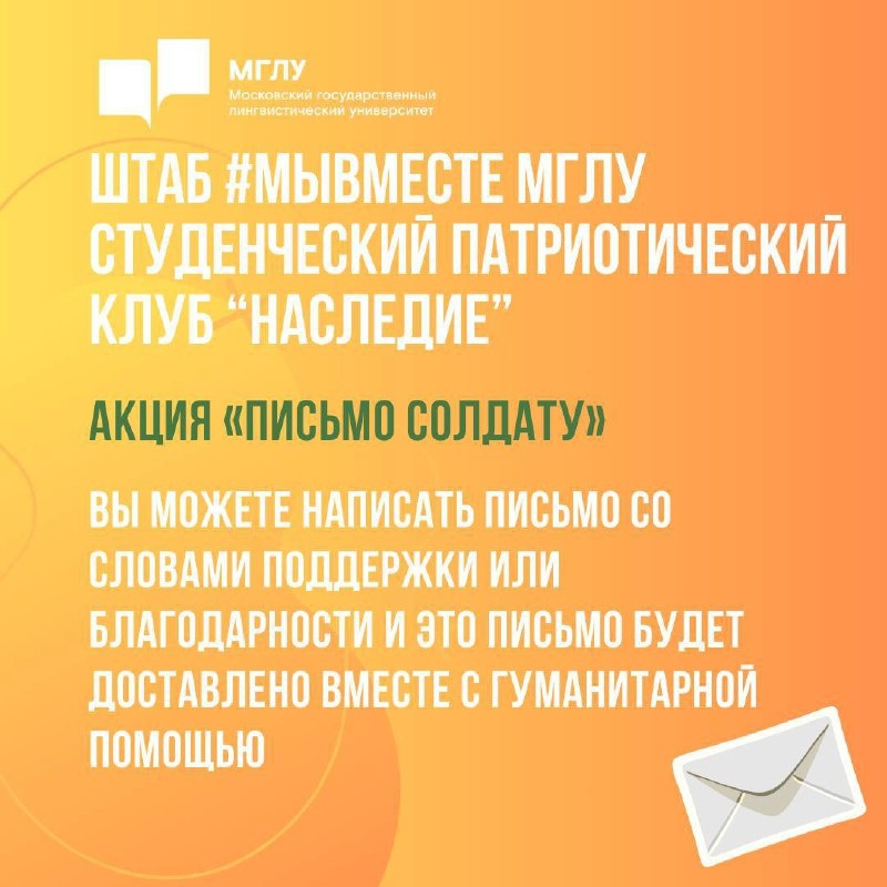 » ✉️ Приближается важный праздник — День защитника Отечества. Это прекрасный повод поддержать наших военнослужащих, отправляя им слова благодарности и тепла. 🔈 Приглашаем вас присоединиться к традиционной акции «Письмо солдату». Ваши искренние строки — это больше, чем просто письмо. Это знак того, что их служба замечена и ценна для каждого из нас. ✨ Простое письмо может подарить солдату тепло ✨ Это наш общий способ выразить благодарность 🗓 Даты проведения акции: 19 и 20 февраля 2026 года. ул. Остоженка 38с1, холл, 1 этаж ⬇️ Как принять участие? 1. Наши волонтёры выдадут вам праздничные открытки, на которых вы сможете написать свои послания. Вы также можете заранее написать письмо и передать его нашим волонтерам. 2. После того как вы напишете ваше послание на открытке или напишете письмо, наши волонтёры заберут их у вас для подготовки к отправке. 3. Мы гарантируем, что ваша поддержка дойдет до адресатов. 🚩 Ваши письма ждут наши солдаты — те, кто ежедневно проявляет мужество и