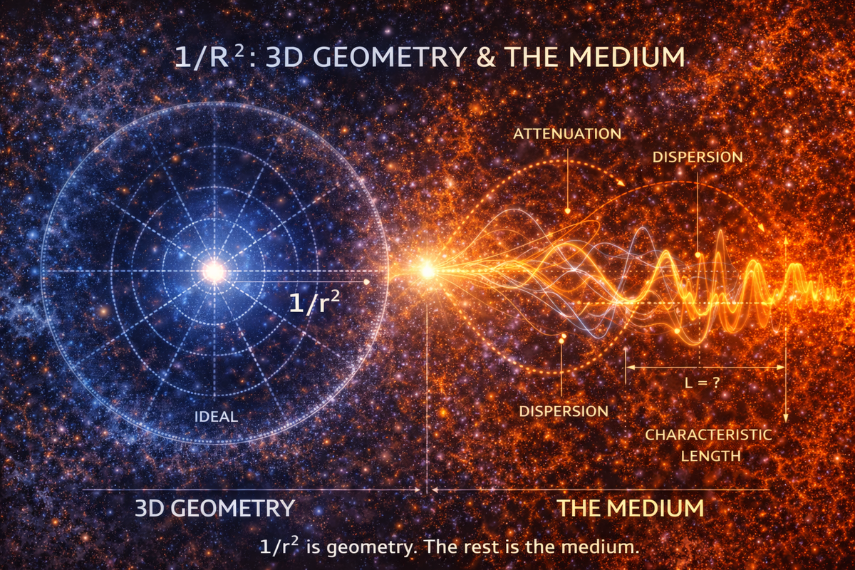 Есть формула, которая у многих сидит в голове как “заклинание природы”: сила (или влияние) убывает как 1/r². Гравитация – 1/r². Свет от лампочки – 1/r² (интенсивность). Электрическое поле точечного заряда – тоже 1/r². И возникает соблазн: будто сама Вселенная “любит квадрат”, будто это фундаментальный закон в стиле «так устроено мироздание». UCM-T предлагает спокойный разворот: во многих случаях это не “магия силы”, а следствие геометрии трёхмерного мира плюс способ переноса в носителе. А где начинает ломаться 1/r² – там и появляется шанс “увидеть среду” как носитель режимов. Представь источник, который излучает “что-то” равномерно во все стороны: энергию, поток, вероятность регистрации, влияние – неважно, что именно. В трёхмерном мире фронт такого распространения (при изотропии) – сфера радиуса r.
