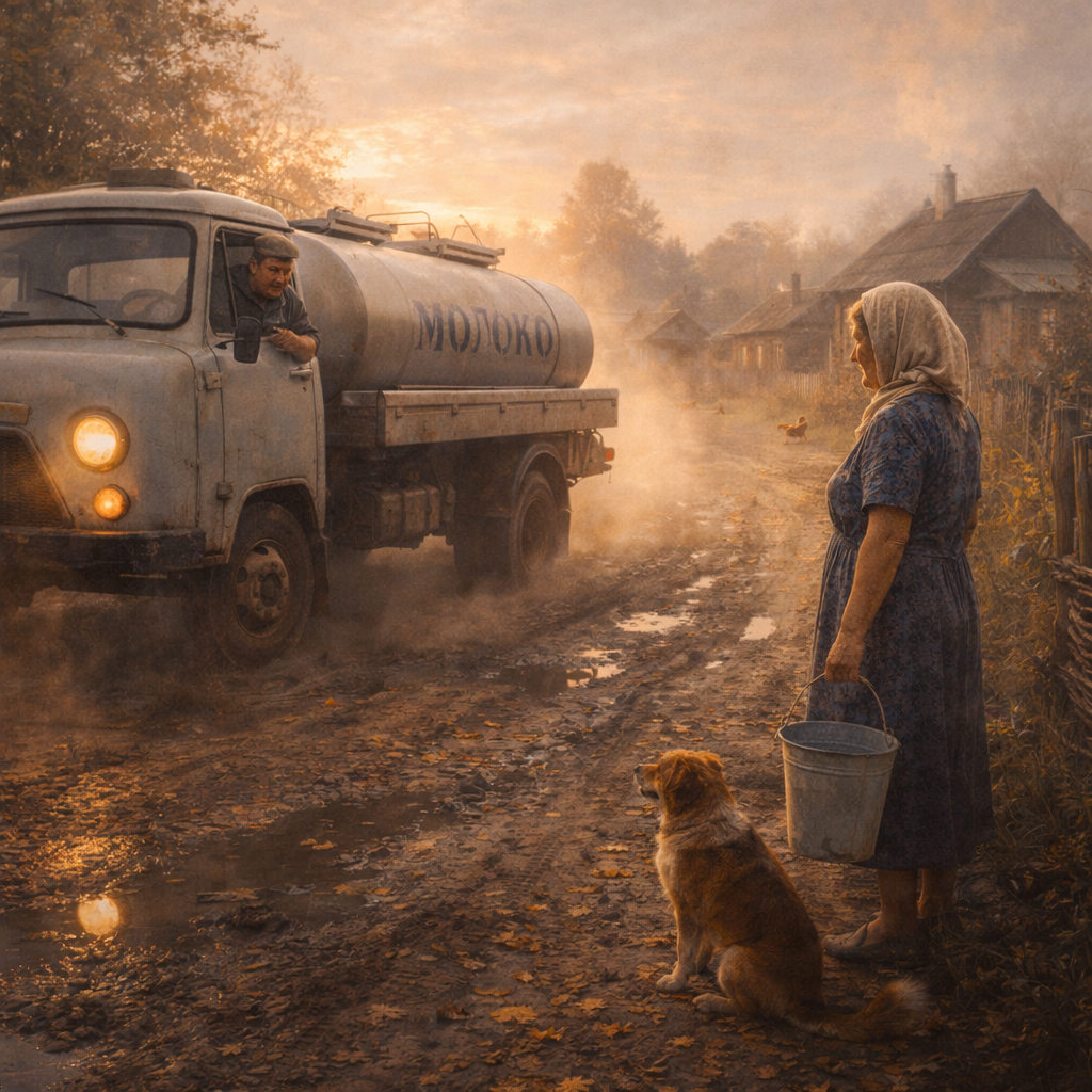 Молоковоз остановился в клубах пыли, водитель — дядя Коля из соседнего села, толстый и добродушный — вылил молоко из её вчерашнего вклада в цистерну, звякнув оцинкованной крышкой.