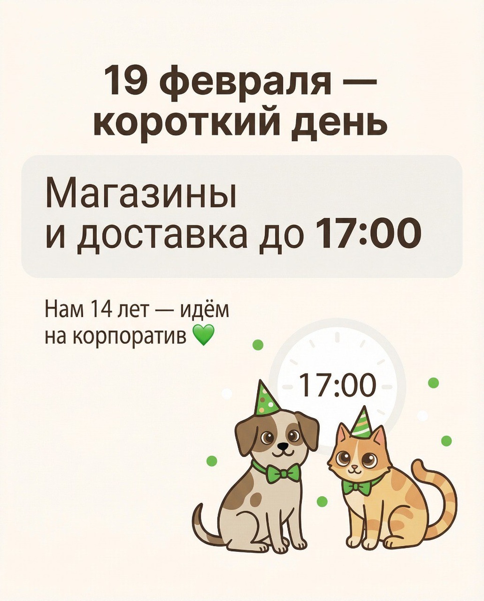 19 февраля работаем до 17:00 — и магазины, и доставка.