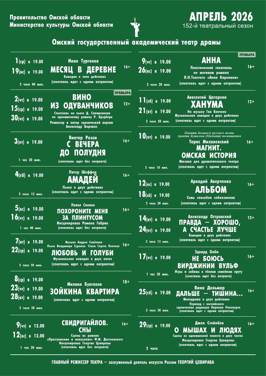! Дорогие зрители, 19 февраля в 12:00 в кассе театра и на сайте omskdrama.ru открывается продажа билетов на апрельский репертуар Омского академического театра драмы! Обратите внимание, продажа билетов на премьерный спектакль "Мама" на Камерной сцене имени Татьяны Ожиговой откроется позднее, об этом мы сообщим дополнительно. Друзья, планируйте поход в театр заранее! #ОмскКультурнаястолица2026