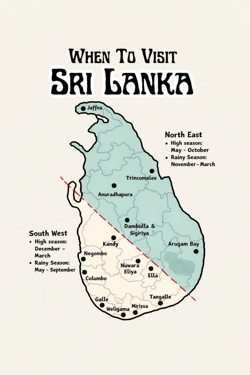 ? 💢Шри-Ланка небольшой остров, но с очень разным климатом. Здесь работают два муссона, и они приходят в разное время в разные части страны. Поэтому, когда на одном побережье идут дожди, на другом солнце и спокойное море. 💢Именно поэтому Шри-Ланка подходит для отдыха круглый год , важно просто выбрать правильный регион. Как устроена погода на острове Условно страну делят на две климатические зоны: Юго-запад Северо-восток Их сезоны противоположны. Это удобно, в любое время года можно найти хорошую погоду. 🌴 Юго-запад Шри-Ланки Лучшее время: декабрь — март Сюда относятся: Коломбо Негомбо Хиккадува Унаватуна Хабарадува Галле Ахангама Мирисса Велигама Тангалле Канди Нувара-Элия Элла ☀ Сухой сезон (декабрь — март) В это время на южном и западном побережье солнце, спокойный океан и комфортная температура. Это лучший период для: пляжного отдыха наблюдения за китами в Мириссе серфинга в Велигаме прогулок по форту Галле поездки на поезде в Эллу посещения чайных плантаций в Нувара-Элии 🌧