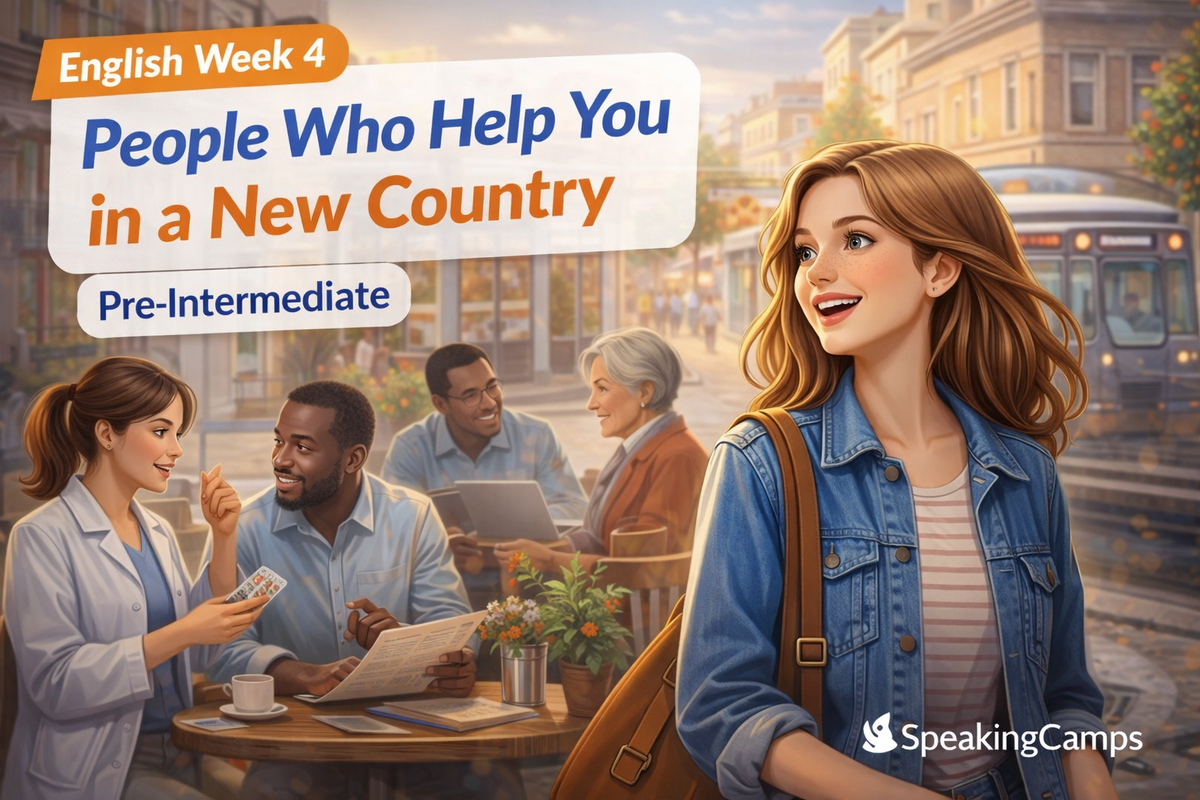 Open the app → Pre-Intermediate camp with the same name as this post (Week 4: People who help you in a new country).