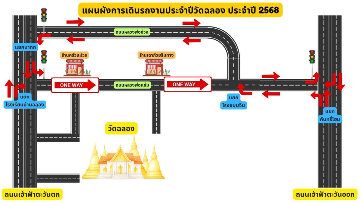 Полиция Чалонга временно реорганизовала движение по дороге Luang Pho Chaem Rd. Как и в предыдущие годы, идущая за храмом улица сделана односторонней на время ярмарки Wat Chalong Fair. Движение возможно только с запада на восток – и очень медленно. «Дорога 📍Luang Pho Chaem Rd. будет односторонней на всем отрезке у 📍храма Wat Chalong. От водителей требуется строгое соблюдение предписаний временных дорожных знаков и указателей. Дорога 📍Luang Pho Chuang Rd. будет выполнять функции альтернативного маршрута для снижения нагрузки в пиковые часы», – говорится в уведомлении полиции Чалонга от 16 февраля. Понедельник, 16 февраля, был первым днем основной программы ярмарки Wat Chalong Fair, которая продлится до 22 февраля включительно. На все дни запланированы вечерние концерты, и в первый из вечеров состоялись выступления группы Skypass и исполнительницы песен «лук тхунг» по имени Фон Танасунторн. Они заменили группу Bodyslam, которая анонсировалась в ноябре, но в итоге не приехала (при э