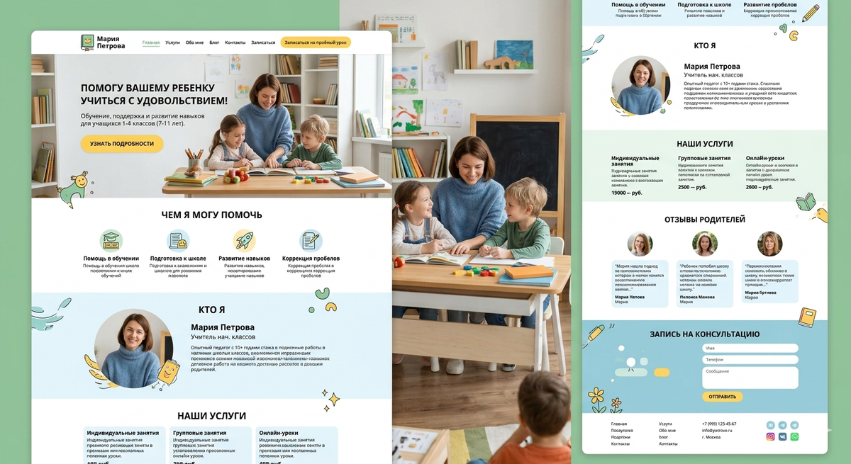 💡 Важно: сайт учителя не требует сложных функций. Достаточно одностраничного лендинга с контактами и разделами о вашей работе.