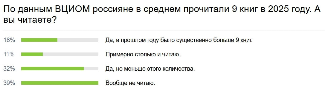 По данным ВЦИОМ, россияне в среднем прочитали 9 книг в 2025 году. В связи с этим мы решили узнать у хабаровчан, читают ли они и, если да, то как часто. Большая часть опрошенных честно призналась, что вообще не читает. 32% все же иногда берутся за книги, но за год они осиливают меньше 9 произведений. 18% читают существенно больше, а 11% точно попадают в рамки статистики. Отметим, что на главной странице DVHAB.ru каждую неделю проводятся опросы на самые актуальные и острые темы. Найти их вы можете, пройдя по ссылке. Напомним, согласно прошлому опросу, только 23% хабаровчан считают, что снег с проезжей части стали убирать быстрее и качественнее этой зимой. При этом 40% респондентов не заметили никаких изменений по сравнению с предыдущими сезонами.