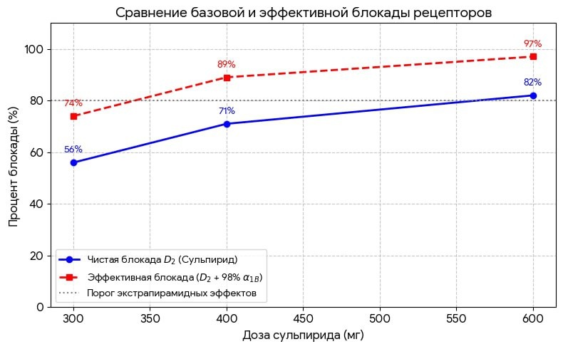 Я как-то уже упоминал в контексте тразодона, а может и НЕ ТОЛЬКО, что блокада альфа1Б рецептора, повышает доступности пресенаптических D2 ауторецепторов. Для примера взята 98% блокада (50-150 мг тразодона как раз блокирует 93-98% данного рецептора). И две линии показывающих, сколько сульпирид заблокирует ауторецепторов без и с ,блокадой альфа1Б рецепторов, при концентрации эквивалентной 300-600 мг (но 600 тут для примера, так сульпирид принимать надо 3 раза в день, а 600 мг/сут обычно предельная анти негативная/fантидепрессивная доза (200 мг х3 раза в день), дающая концентрацию в течение суток около 300 или даже +/-50 примерно мг в течение суток. Механизм примерно такой, блокада альфа1Б резко активирует многократно увеличивает доступность высоко-чувствительных к дофамину ауторецепторов, и номинально поднимает аффинитет сульпирда в 10 раз к ауторецепторам. ПРИ этом аффинитет и процент блокады постсинаптических D2(!) не меняется, ТО ЕСТЬ усиливается ТОЛЬКО растормаживающий (блокада аут