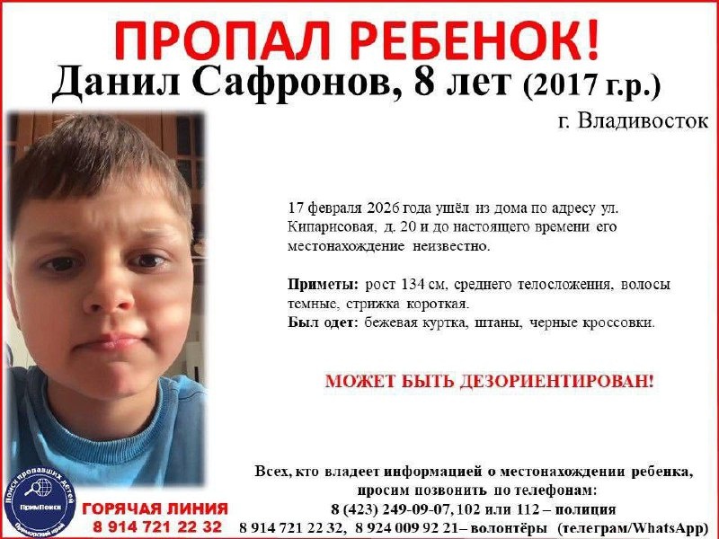 ! Данил Сафронов, 8 лет (2017 г.р.) г. Владивосток 17 февраля 2026 года ушёл из дома по адресу ул. Кипарисовая, д. 20 и до настоящего времени его местонахождение неизвестно. Приметы: рост 134 см, среднего телосложения, волосы темные, стрижка короткая. Был одет: бежевая куртка, штаны, черные кроссовки. МОЖЕТ БЫТЬ ДЕЗОРИЕНТИРОВАН! Всех, кто владеет информацией о местонахождении ребенка, просим позвонить по телефонам: 8 (423) 249-09-07, 102 или 112 – полиция 8 914 721 22 32, 8 924 009 92 21– волонтёры (телеграм/WhatsApp) #поиск_Сафронов
