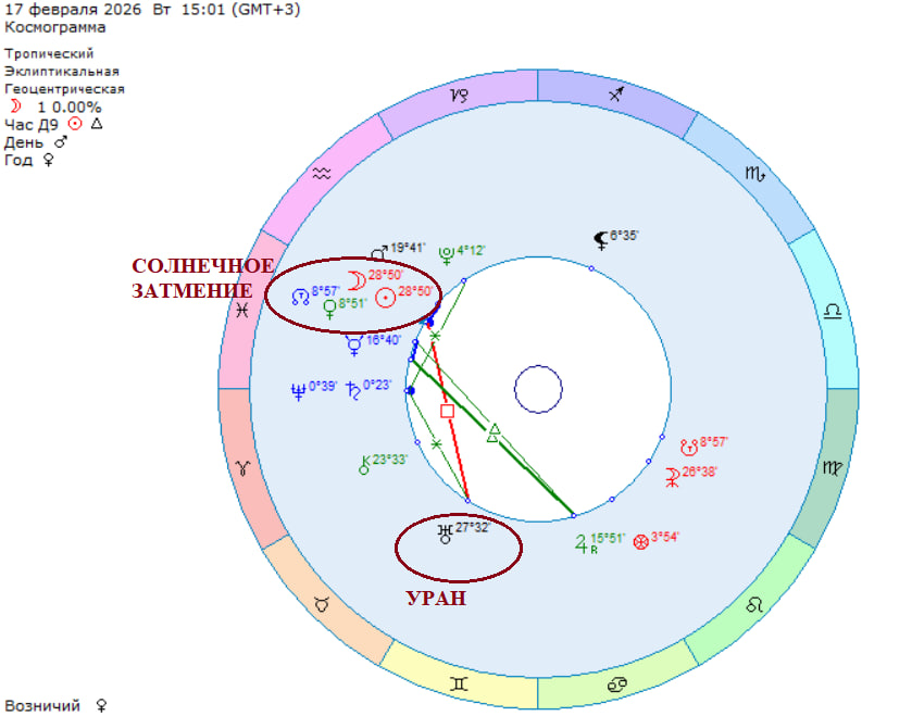 17.02.2026 в 15:01 МСК состоится пик Солнечного затмения, которое пройдёт в 29 градусе знака Зодиака Водолей, в напряжённом аспекте(квадрат) к Урану в Тельце, который вышел из ретро движения (об этом писала здесь ) и является управителем этого затмения..