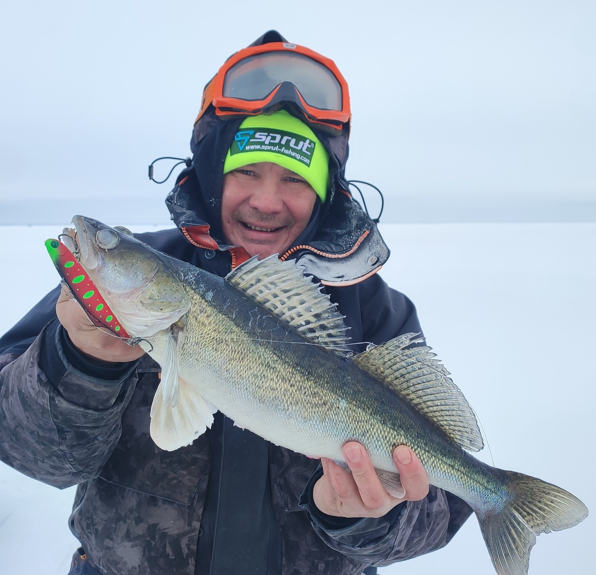 Ещё я считаю, что мне очень повезло в этом году с обстановкой на льду на нашем водохранилище. Снега мало, и вода под снежным покровом отсутствует, как в других регионах, не то что на технике, пешком передвигаться нельзя. Ну а теперь о рыбалке.) GPS ловит плохо, и как только включается, пытаешься заехать на самые перспективные точки, где знаешь, что точно присутствует колючий. Только угадать с размером и цветом приманки в моём случаи по ратлинам гадать не нужно, три фаворита Tanto Slim от Sprut, один из них на фото в 105 размере. Вроде и глухозимье, но судак даже небольших размеров клюёт очень жадно и бодро. Особо сильно не погоняешь по просторам Куйбышевского водохранилища из-за отсутствия сигнала космоса, и приходится подбирать проводку для более эффективного соблазнения клыкастого. Глубины не меняются и варьируется