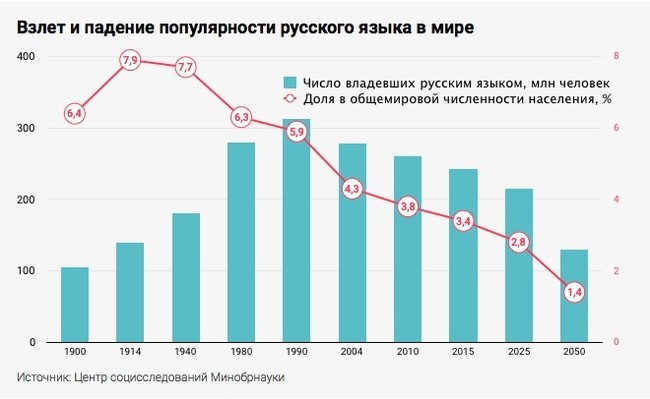 Есть такое расхожее выражение «Пиррова победа». Это когда победа приводит к результату, противоположному цели военной кампании. Происходит из истории войны эпирского царя Пирра с молодым еще Римом, когда серия побед (при Геркалее и Аускуле) по итогам только ослабила царя и ничем не помогла городу Таренту, через семь лет всё равно покинувшему греческий мир и ставшему частью Римской империи. Если мы напряжем память, то не сразу, но вспомнится повод нашего затянувшегося противостояния с юго-западным соседом – притеснения русского языка. Сколько сил и средств вложено в борьбу за него, сколько побед одержано – и не сосчитать... А как там язык-то? Вот общая картина: Нет, я далек от мысли, что сокращение аудитории русского языка после 2014 года вызвано исключительно непосредственными результатами борьбы за него, но как говорится, картина маслом... И вот новость последней недели Изменен статус русского языка в Казахстане (а там вторая по численность русская диаспора и полно, как сейчас принят