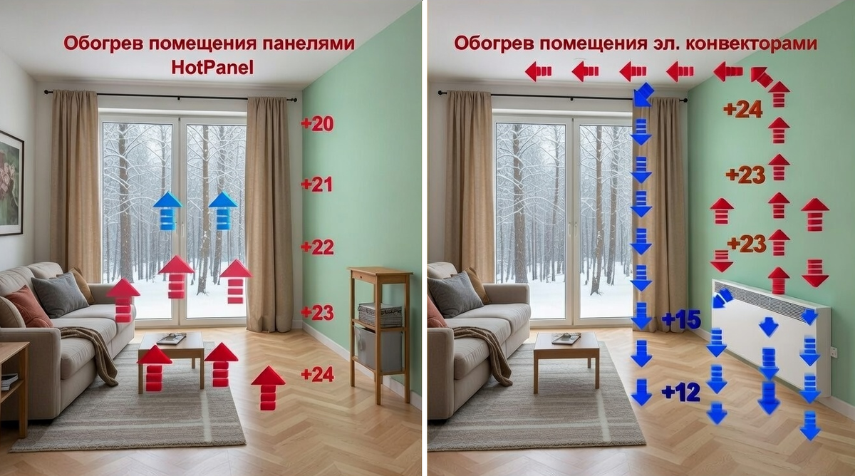 Взгляните на два изображения одной и той же гостиной. За большим окном — зимний лес, морозный пейзаж. В комнате работает отопление. Но результат работы двух разных систем — принципиально отличается. На первом рисунке мы видим, как работает система «теплый пол» (в данном случае — нагревательные панели HotPanel). Стрелками показаны восходящие потоки теплого воздуха: ✅ Что мы видим: На втором рисунке — та же комната, но вместо тёплого пола установлен обычный настенный конвектор. Потоки воздуха распределяются совершенно иначе: ❌ Что мы видим: Сравнение наглядно показывает ключевое преимущество системы «теплый пол» перед настенными конвекторами: ✅ Равномерность прогрева