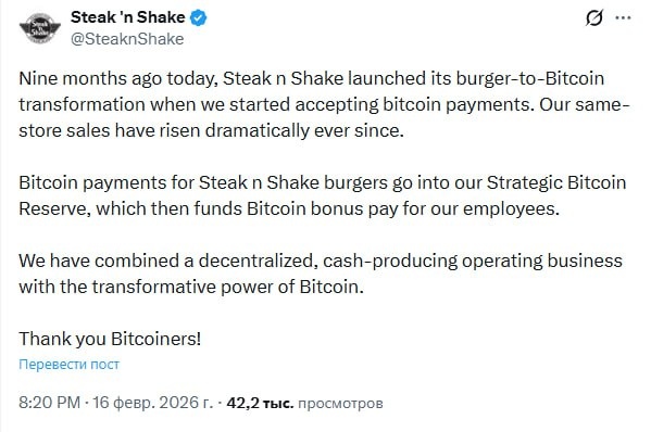 биткоинах. С тех пор продажи в наших сопоставимых ресторанах значительно выросли. Платежи в биткоинах за бургеры Steak n Shake поступают в наш Стратегический биткоин-резерв, который затем используется для выплаты биткоин-бонусов нашим сотрудникам. Мы объединили децентрализованный операционный бизнес, генерирующий денежный поток, с преобразующей силой биткоина. Спасибо, биткоинеры!