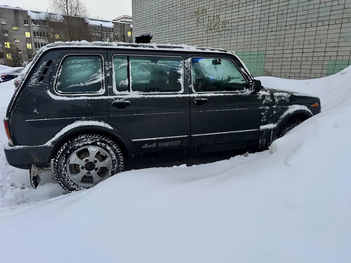 Всем привет. Почти неделю катаюсь на Ниве 5Д. Брал ее с рук и кому интересно, первая часть - здесь. Обошлась она мне в 460 000. Оформился за день, с сохранением номера. Оформление, со страховкой встало в 11000 примерно. Потом сразу поехал на авторынок за зимними шинами. Плюс еще 21000 рублей за комплект. Шины взял китайские. Что поделать - бюджет. Потом погнал в автосервис, к знакомому. Там сразу под замену масло, прокладку в двигателе и свечи. Еще тысяч 6 вместе с работой. Ну и замена "самовара": 1600 рублей - брал на авторынке, плюс хомут 100 рублей. Машина снизу ржавая, но бодрая. Ржавая потому, что полгода стояла - ждали вступление в наследство. Дно - антикор. Что по комплектации: Теперь по впечатлениям. Первые - очень приятные. Она больше моей 3Д, что имеет два момента основных: В общем пока так. Напоминаю - брал ее 50/50. Для командировок по гуманитарному разминированию и перевозки старинной мебели, между командировками. Пока все. Спасибо за донаты! Они сейчас ой, как нужны. Все