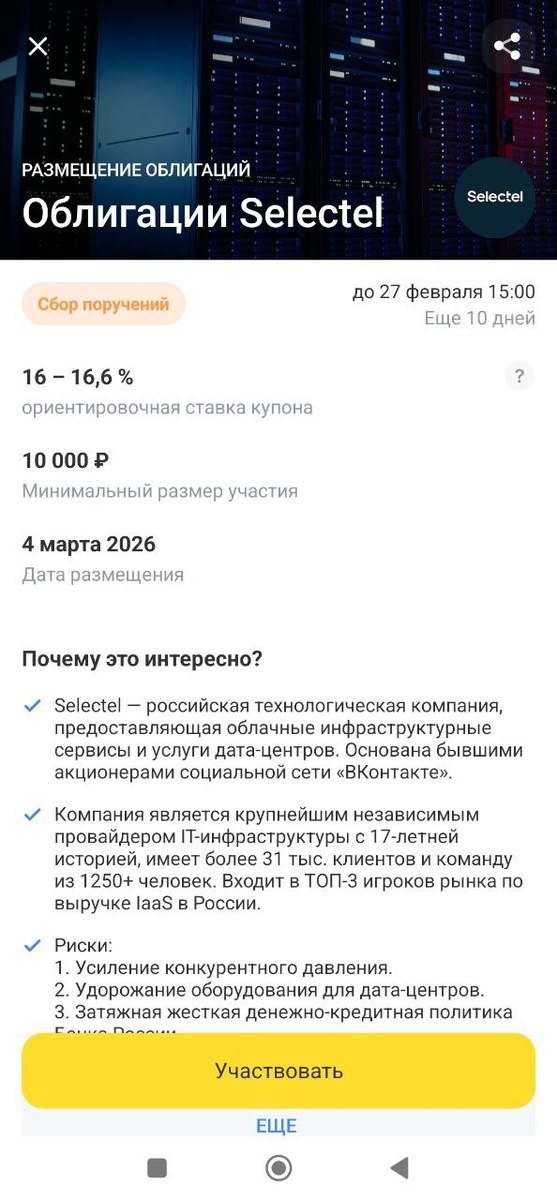 🚀 Всем привет! Разбираем отчетность одной из топовых российских IT-компаний — Selectel. Спойлер: это тот случай, когда цифры радуют глаз инвестора. 📈 💼 Финансовые показатели (9 месяцев 2025): · Выручка: Выросла на +42% (г/г), достигнув 13,5 млрд рублей . Компания растет быстрее рынка. · EBITDA (скорр.): Увеличилась на +44% (г/г) до 7,8 млрд рублей . · Рентабельность по EBITDA: Держится на крутом уровне в 58% . Это показывает высокую эффективность бизнеса. 🤝 Клиентская база: Количество клиентов перевалило за 31,2 тысячи, увеличившись на 20% за год. Причем растут все сегменты — от малого бизнеса до крупных корпораций, что говорит о диверсификации и устойчивости . 📉 Долговая нагрузка: Очень важный момент для облигационеров — долговая нагрузка снижается! · Соотношение NetDebt/EBITDA улучшилось с 1,9х до комфортных 1,7х . · Рейтинги: ruAA- от "Эксперт РА" и А+(RU) от АКРА, прогноз "Стабильный" . 💰 Что по облигациям? В обращении 4 выпуска с доходностью от 16.3% до 18.3% годовых
