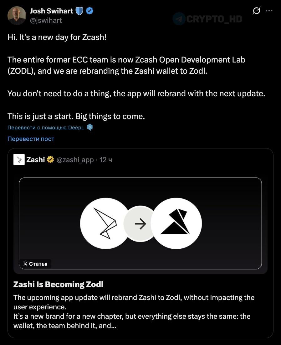 ΠΡΠ²ΡΠΈΠΉ CEO Electric Coin Company Π·Π°ΡΠ²ΠΈΠ» ΠΎ ΡΠΎΠΌ, ΡΡΠΎ Π½Π°ΡΠΈΠ½Π°Π΅ΡΡΡ Π½ΠΎΠ²ΡΠΉ ΡΡΠ°ΠΏ ΡΠ°Π·Π²ΠΈΡΠΈΡ ΠΏΡΠΎΠ΅ΠΊΡΠ°, Π° ΠΊΠΎΠΌΠ°Π½Π΄Π° ΠΏΡΠΎΠ΄ΠΎΠ»ΠΆΠΈΡ ΡΠ°Π±ΠΎΡΡ ΡΠΆΠ΅ Π² ΠΎΠ±Π½ΠΎΠ²Π»Π΅Π½Π½ΠΎΠΉ ΡΡΡΡΠΊΡΡΡΠ΅ ΠΏΠΎΠ΄ Π±ΡΠ΅Π½Π΄ΠΎΠΌ Zcash Open Development Lab (ZODL). β€ ΠΡΡ Π±ΡΠ²ΡΠ°Ρ ΠΊΠΎΠΌΠ°Π½Π΄Π° ECC ΠΏΠ΅ΡΠ΅ΡΠ»Π° Π² ZODL. β€ ΠΠΎΡΠ΅Π»Π΅ΠΊ Zashi ΠΏΡΠΎΡ