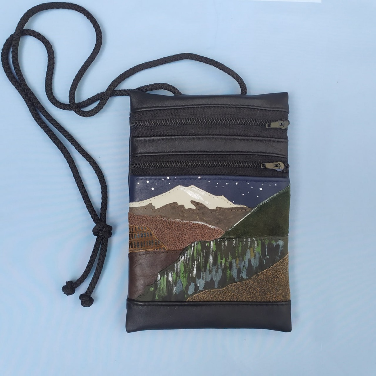 ...а ещё у меня на сумочках есть Эльбрус. Рядом с Эльбрусом -- хвойный лес. Вы его там видите? Да? А его там нет. Просто мазки краски. И Эльбруса там нет, просто кусочек кожи. Но вы же его видите, да?