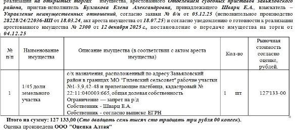 " рабочие участки №1-3,9,42-48 и прилегающие пастбища, кадастровый № 22:11:040003:665, общая долевая собственность.Нач. цена 127133 руб. (Ограничение — запрет на р/д, Собственник - Шварц Е.А. Собственник - согласно выписке ЕГРН.) (2300) Канал: Госземля Алтайский край Область: край Алтайский Завьяловский район в границах МО "Гилевский сельсовет" рабочие участки №1-3 Район: 9 Населенный пункт: 42-48 Локация: Смотреть на карте ВРИ: - Кадастровый номер: 22:11:040003:665 Кадастровая стоимость: - Вид сделки: Продажа Площадь: - Начальная цена: 127133.00 руб. Дата завершения: 16.03.2026 Подробнее: ГИС ТОРГИ #госземля #земляотгосударства #земля #земельныйучасток #земельныеторги #торги #аукцион #продажаземли #продажа #алтайскийкрай