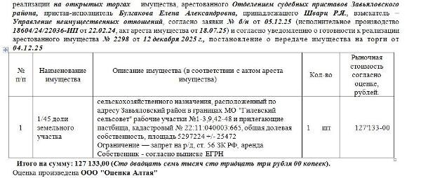 "Гилевский сельсовет" рабочие участки №1-3,9,42-48 и прилегающие пастбища, кадастровый № 22:11:040003:665, общая долевая собственность, площадь 5297224 +/- 25472. Нач. цена 127133 руб. (Ограничение — запрет на р/д, ст. 56 ЗК РФ, аренда, Должник Шварц Р.Я., Собственник - согласно выписке ЕГРН) (2298) Канал: Госземля Алтайский край Область: край Алтайский Завьяловский район в границах МО "Гилевский сельсовет" рабочие участки №1-3 Район: 9 Населенный пункт: 42-48 Локация: Смотреть на карте ВРИ: - Кадастровый номер: 22:11:040003:665 Кадастровая стоимость: - Вид сделки: Продажа Площадь: 5297224 м² Начальная цена: 127133.00 руб. Дата завершения: 16.03.2026 Подробнее: ГИС ТОРГИ #госземля #земляотгосударства #земля #земельныйучасток #земельныеторги #торги #аукцион #продажаземли #продажа #алтайскийкрай